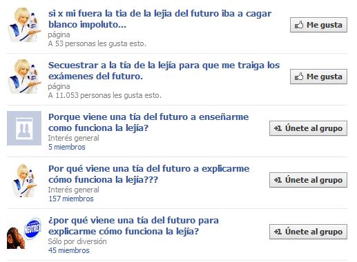 También he podido comprobar como en facebook tiene páginas de fans y grupos donde se preguntan cosas interesantes acerca de sus viajes temporales (Viajes todo sea dicho que hace a pelo, sin un DeLorean como en Regreso al Futuro, con lo que doy por hecho que el ahorro energético se suma a las buenísimas propiedades que ya de por sí parece ser que tiene la lejía).