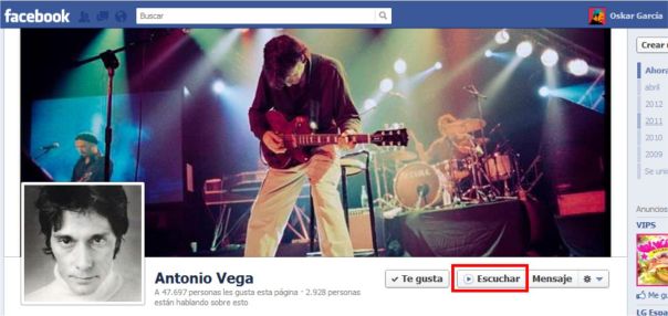 Este post os va a resultar de mucha utilidad a todos aquellos que lleváis el managment de página de fans /empresa que tienen relación con el mundo de la música y ahora veréis porqué. Desde Social Monkers nos estamos empezando a especializar en este tipo de clientes, y en base a los que ya tenemos y a nuestra inquietud por aportar a los mismos novedades y nuevas funcionalidades permanentemente hemos detectado que es posible la incorporación de un botón llamado ‘escuchar‘ en nuestras páginas, que como veis en la imagen inferior, que se sitúa justo entre el botón de ‘Me Gusta / Te Gusta’ y el de ‘Mensaje’.