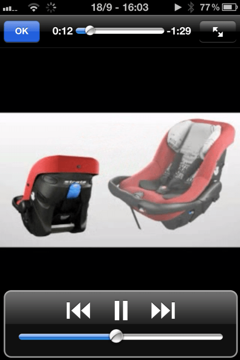 Pues si, es un QR y esto en sí ya no es una novedad, sin embargo, a mi me ha gustado mucho el detalle por una razón: Cuando sales de casa con el crio, la silla, y el resto de cosas, no llevas el manual de instrucciones (mega libraco) y si lo pensáis es genial que si tenemos alguna duda, podamos directamente con nuestro smartphone aclararnos en instantes. Hubo otra sorpresa y es que el QR no lleva a ninguna página de instrucciones como yo pensaba, sino que directamente lleva a un vídeo que muestra todos los pasos para instalar el ‘cuco’ en el vehículo… simplemente fantástico y muy muy útil.