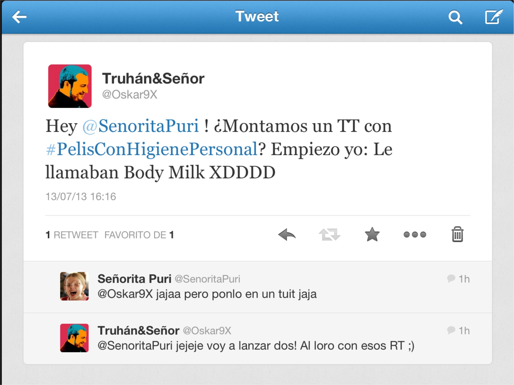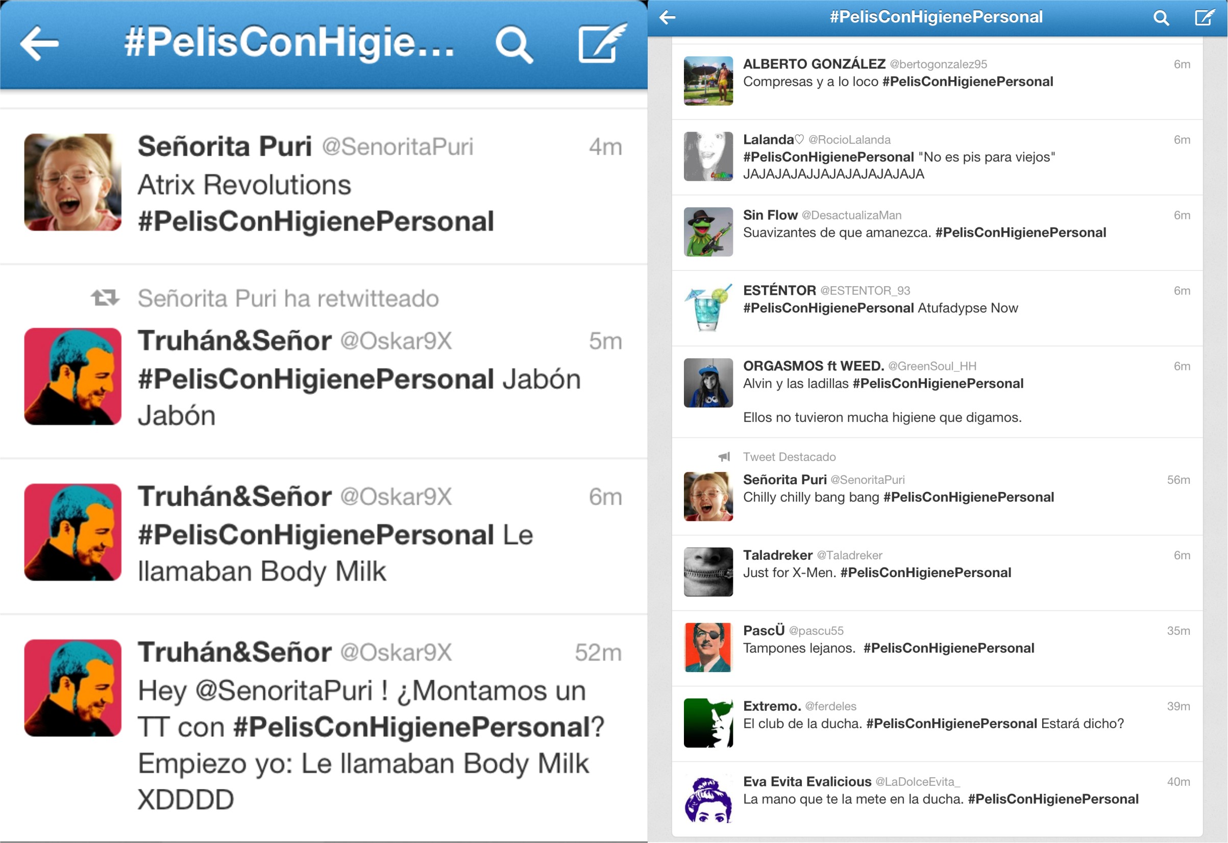 No había nada preparado ni previsto, así que podéis ser testigos de lo que el aburrimiento estival puede ser capaz de generar. El caso es que me vinieron a la cabeza algunos hashtags superdivertidos que suelen tener mucho éxito en twitter y que casi siempre llevan el concepto ‘pelis’ asociado, así que ni corto ni perezoso, se me ocurrió que podría utilizar #PELISCONHIGIENEPERSONAL para movilizar a la gente (una chorrada como otra cualquiera). Claro, para lograr la misión siempre se necesita aliados y yo quería contar con la mejor, la Señorita Puri, a la que sigo/me sigue desde hace tiempo y que tiene un sentido del humor fantástico que conecta muy bien conmigo. Puri, además, es autora de un divertidísimo libro ‘TE DEJO ES JÓDETE AL REVÉS‘ que ha sumado a sus ya números followers bastantes más hasta convertirlos en 67.500. Bueno, pues el caso era probarlo: