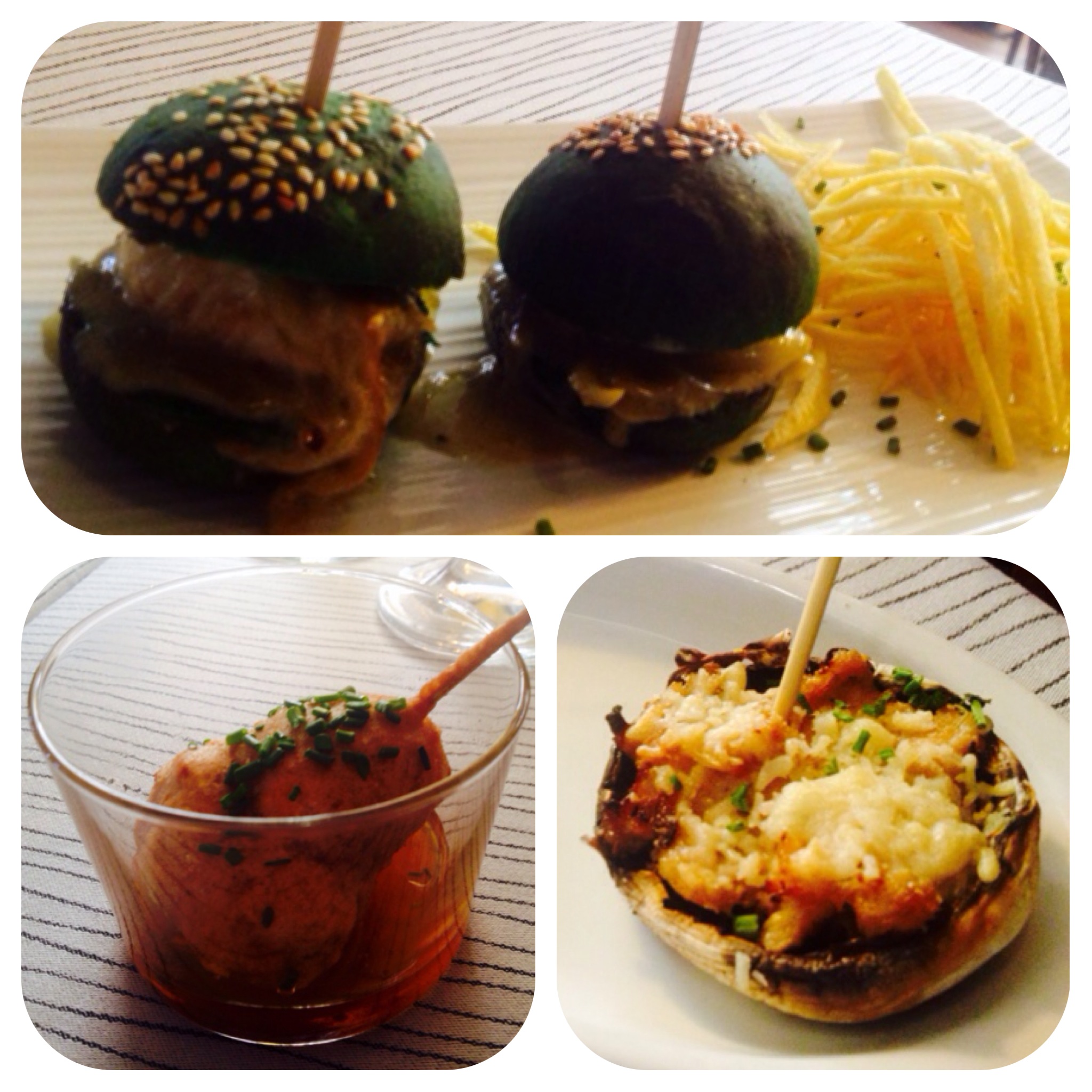 No lo he comentado, pero vamos a comer con la oferta de un bono de Groupalia, el que salió con un menú para 2 personas x 25€. Nada mas sentarnos en la mesa nos obsequian con 2 champiñones gratinados rellenos con atún, francamente ricos, y 2 brochetas rebozadas de pulpo y patata. Este pincho es muy original y os explico porqué: Se trata de aunar bajo un rebozado el concepto de pulpo + cachelo, y el resultado es francamente bueno. Un bocado jugoso, un trozo muy generoso y el único pero que le puedo poner es que la salsa que se acompaña es aceite, y debería tener algo más de sabor. Yo propondría aprovechar un poco de agua de cocción del pulpo, añadir pimentón agridulce, aceite, y darle el toque personal que haga que al buñuelo haya que mojarlo imperiosamente. Pero vamos, otro detalle genial y esto solo una sugerencia. Queremos también su bocado de autor, las famosas ‘tortuguitas’ y la verdad, son muy originales y divertidas. La presentación está muy bien, el pan verde (casero) da muchísimo juego, el pollo está tierno, sabroso y su curry tiene punto picante ¡ideales!. También (y esto reconozco que era capricho mio), pedimos una ración de galletas de berenjena con miel y queso, y el equipo de sala, con total honestidad y sabiendo ‘la que se avecinaba’, nos sugiere que traerán media ración para quitarnos el antojo. Tengo que decir que hay que ver que cosa tan simple y a la vez tan rica: Contraste salado-dulce, textura crocante (hay que comérselas rápido que aguanta lo justo) y el queso que le da a todo el conjunto un punto muy meloso y equilibrado. Geniales.