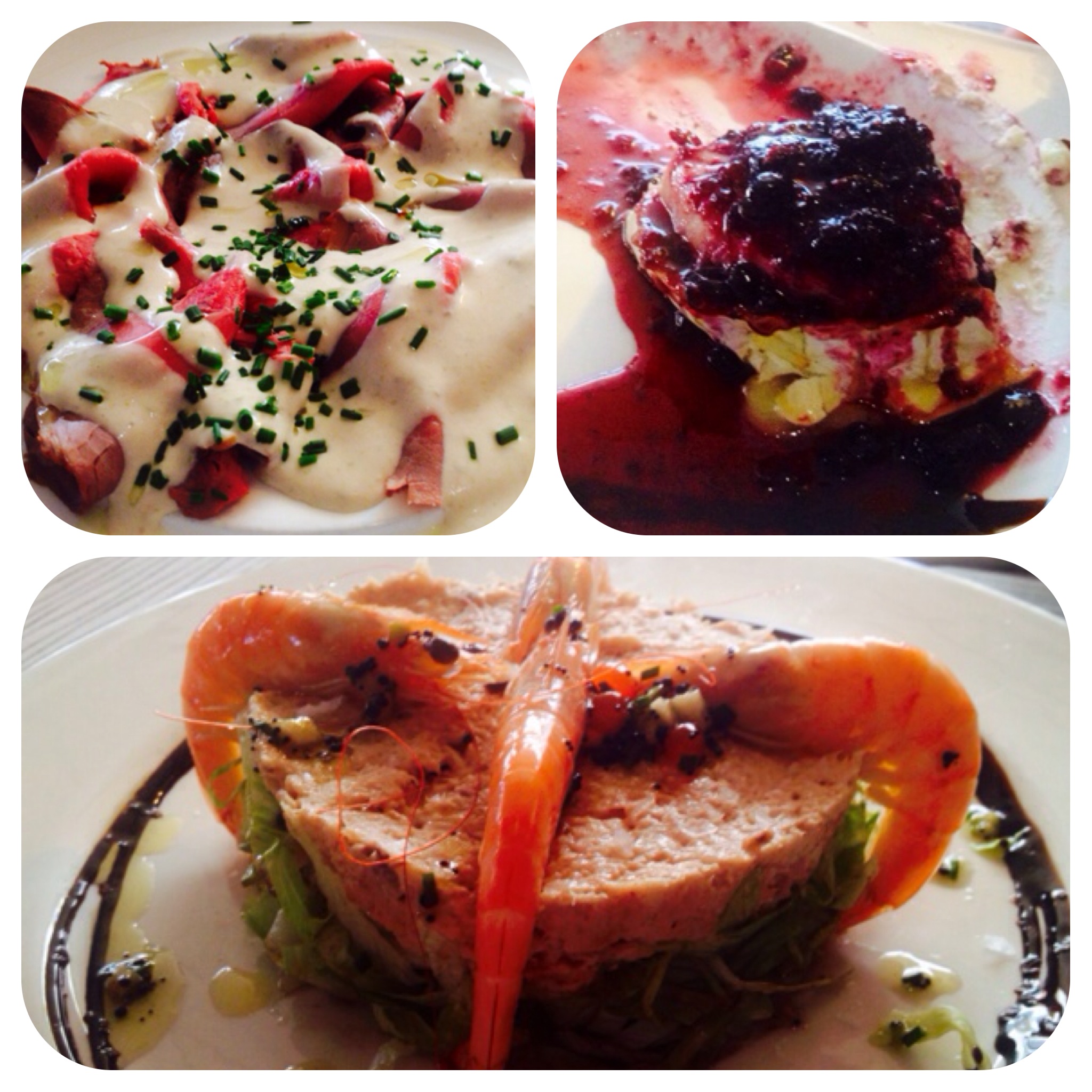 Empezamos con un cocktail de langostinos tremendo, un tamaño grande, una presentación muy acertada y genial de sabor. Al mismo tiempo, aparece un plato de rostbeef con salsa vitello. Lo mismo: Un tamaño inmenso, raciones hipergenerosas, buen corte, sabor y textura de la carne y a mi personalmente, me hubiera gustado que la salsa vitello hubiera tenido mas ‘fuerza’, que traducido quiere decir algo mas de sabor, no se si por ausencia de sal o por otro motivo, si bien como digo, esto son apreciaciones mías porque mi mujer por ejemplo comentó que la salsa la encontraba bien, como digo, el conjunto estaba muy bueno. Después llegó el volcán de queso de cabra con frutos rojos…¡explosión! Si, explosión de sabor, explosión de cantidades y explosión en nuestros estómagos que empezaban a pedir una tregua. Una porción de queso grande, y cuando digo grande os recuerdo que mido 1,90 y peso ciento y pico quilos, vamos, que pariente de los Hobitts no soy. Otro plato buenísimo y que no pudimos terminar, porque a pesar de que todos estaban tremendos, las cantidades como digo son importantes.