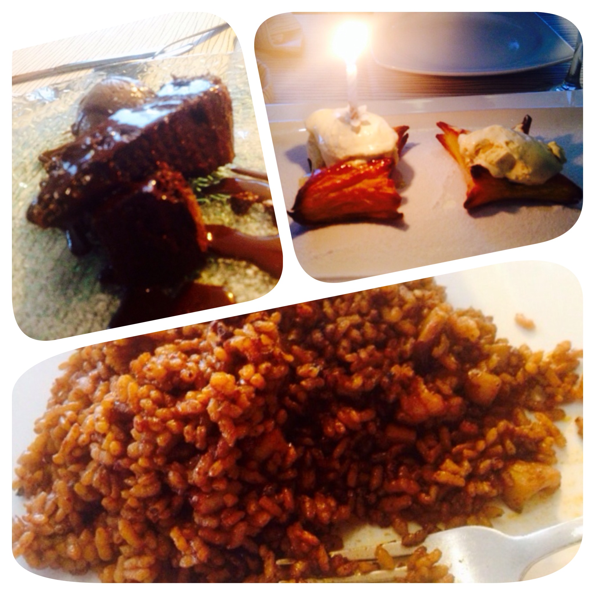 En fin, con una mano en la barriga y luchando por respirar llegó una sorpresita y uno de esos detalles que hablan por si solos: Cuando reservé, le comenté a Vero que al día siguiente (hoy) era el cumple de mi mujer y que le encanta el chocolate, cuanto mas % de puro, mejor. Pues nada, cuando llegan los postres vienen dos deliciosos y crocantes hojaldres de manzana con helado y una velita ¡sorpresón! y además, 2 trozos de un brutal pastel llamado ‘Muerte por chocolate’ que en nuestro caso, podía hacer perfectamente honor a su nombre porque iba a ser la puntilla a un extraordinaria comida ¡que DELICIA! Además, nos abrieron una botellita de cava rosado valenciano para acompañarlos. Mientras, y como el nene se había despertado, estuvieron jugando él y ademas le inflaron un ‘globo’ improvisado para que jugara y pudiéramos tomar el postre tranquilo. Volvemos a lo de antes: Detalles y buen hacer.