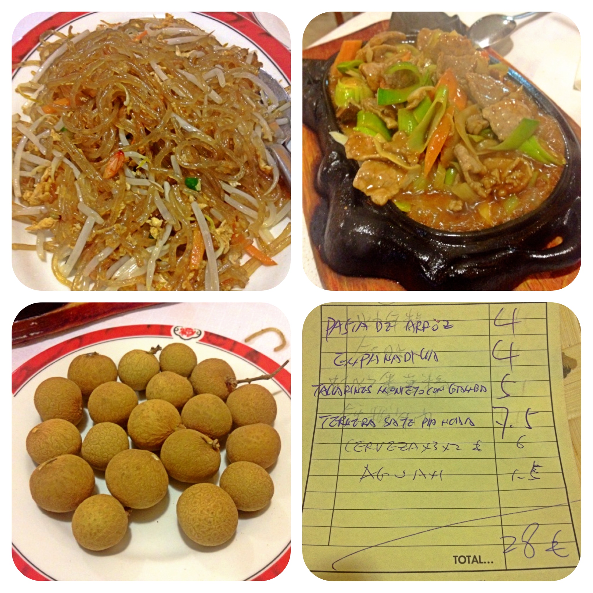 También nos pusieron en mesa los otros 2 platos que completaban nuestro pedido. Por un lado, unos ‘insulsos’ tallarines de boniato con gamba que como cantidad bien, pero como sabor fatal. No sabían a nada y se salvaban la soja y demás verdura que lo acompañaba. La verdad, fue un poco decepcionante. Y por otro, una ternera a la plancha que fue presentada en una típica plancha de hierro al rojo rollo ‘tie-pan’ y que, por desgracia, nos recordó a todos al típico plato del estilo que sirven en un chino de los clásicos del rollito y la salsa agridulce. Estaba rico pero la experiencia gastronómica no iba mas allá un sabor correcto y gustativamente familiar (y la verdad no es lo que esperas cuando buscas comida china china de verdad). En fin, al igual que en Ruyi no hay postres y mientras pedíamos una botella grande de agua nos obsequiaron con un platito de lichys de un tamaño grandecito, que a los que les gusta la fruta comentaron que estaban bastante bien.