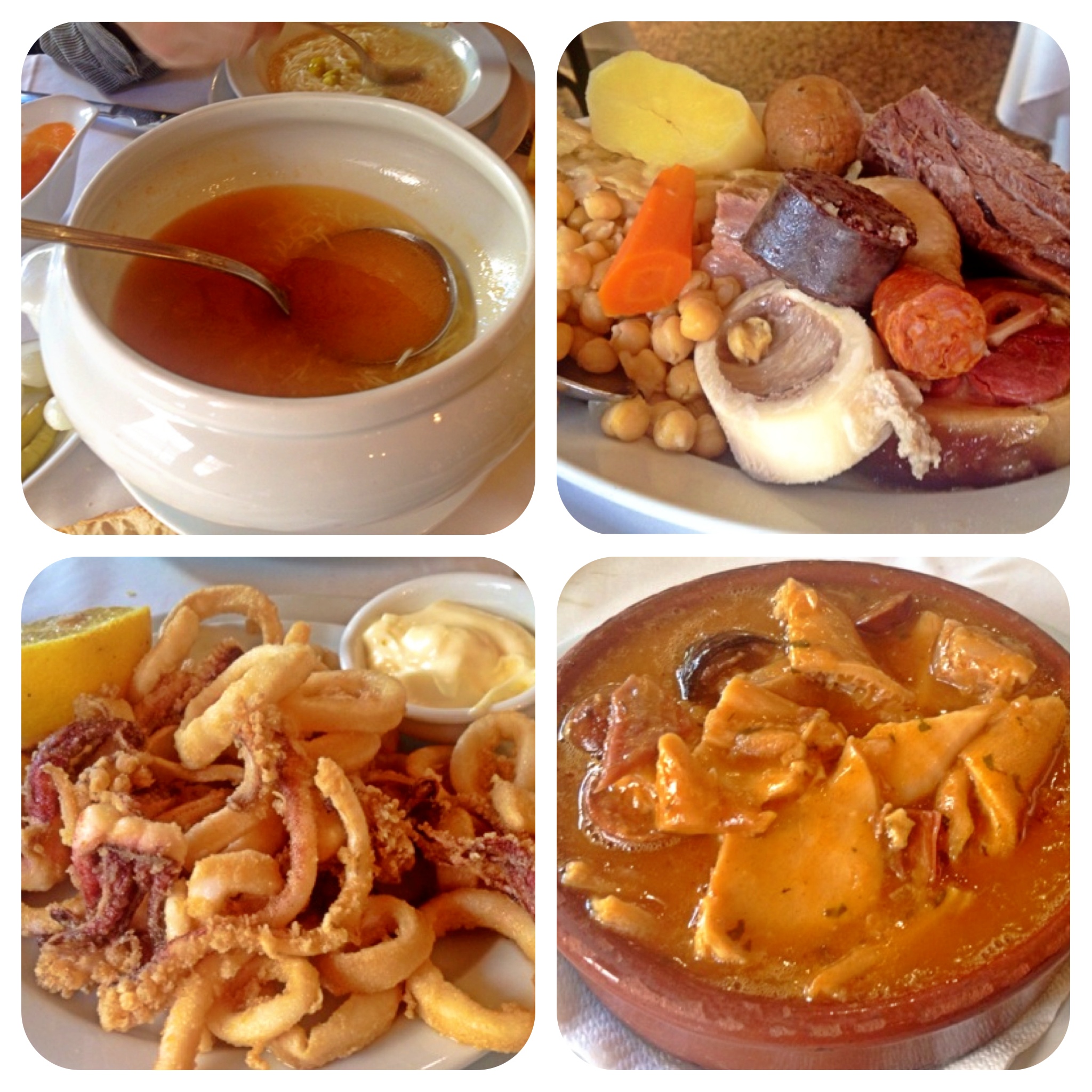 Bueno, con ganas de comer por fin pedimos 2 cañas (2,90€ cada una) que fueron servidas en vaso grande, fresquitas y con la espuma perfecta y llegaron a la mesa unos aportes en forma de 2 panecillos planos y muy sabrosos, algo parecido a tomate con ajo o salmorejo para untar y un platito con guindillas o ‘vironets’ y cebollitas encurtidas en vinagre. Tras esto nos tomaron nota y ya que estábamos ‘madrileñeando’ nos decantamos por 3 clásicos: Cocido, Calamares y Callos, la A y la Z de la cocina chulapona. A la hora de pedir y tras oir la conversación mantenida con la mesa de al lado, le especifiqué al camarero que los calamares irían al centro, que mi plato fuerte serían los callos y que el cocido era para mi compañero pero que yo lo iría probando, y este no puso ningún reparo. Lo primero que llegó a la mesa fue la sopa y he de decir que entre los cubiertos que teníamos cada uno se encontraban los servicios de sopa: Plato hondo y cuchara. Bien, la sopa llegó en una sopera donde habría aproximadamente unas 4 raciones generosas y tanto Pere como yo nos servimos, él de forma generosa y yo algo menos pensando en el resto de mi comida. Decir que estaba sabrosa, con buen color pero nada grasosa y con el fideo algo pasado de cocción eso sí. Estábamos dando buena cuenta de la sopa cuando llegó el plato de calamares a la andaluza acompañados con un poco de mahonesa con un puntito de ajo: Buena cantidad, textura algo gomosa, fritura correcta y sabor mas que agradable. Nada que objetar. Sin embargo, mientras mi compañero se volvía a servir un poquito mas de sopa llegó el tercer detalle feo no, feísimo del día: El camarero sin preguntarme si quería mas o había acabado me retiró el plato y la cuchara y se quedó tan pancho. Ni un comentario. Yo esto lo interpreto solo de una forma: «Mira, te he dejado comer sopa pero no te creas que vas a comer mas si no pagas un servicio completo de cocido» ¿A que suena ridículo? Pues así me sentí yo, como si me estuvieran vigilando y que tuviera que probar el cocido a ‘hurtadillas’, me sentí francamente mal, porque no nos engañemos, yo iba a disfrutar, no a someterme a una auditoria gastronómica ni a vigilancia intensiva. He de añadir también que el resto de la comida que pedimos, equivalía en precio al Cocido, con lo que tampoco nadie nos podía decir que éramos 2 listos que querían comer cocido al precio de uno. Como digo, situación violenta y a mi personalmente me condicionó el resto de la comida… «Gran Hermano te vigila, cuidado«, vaya tela.
