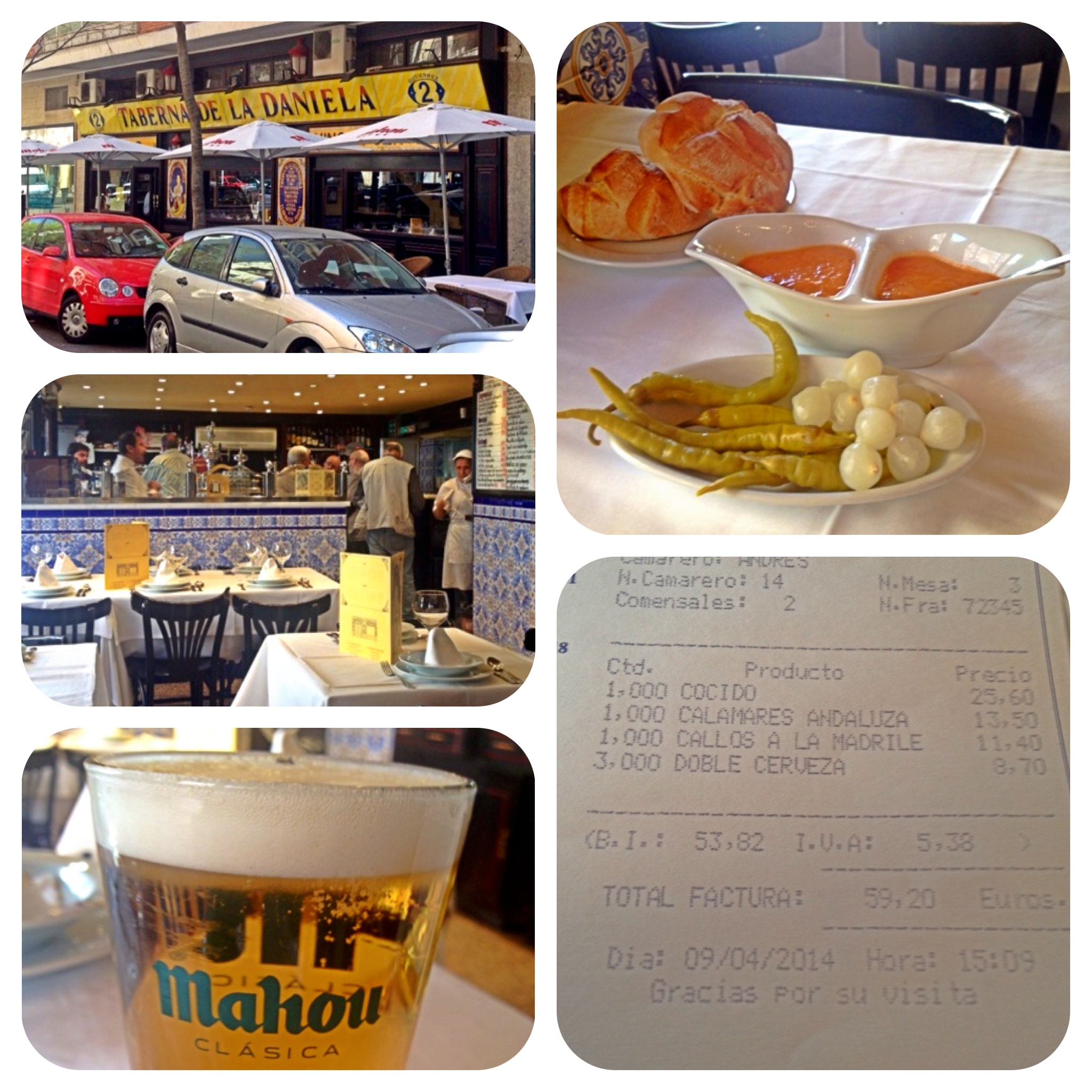 La semana pasada tuve que pasar una jornada por motivos profesionales en Madrid y como iba a desplazarme finalmente en coche y además, iba a estar acompañado por mi amigo Pere, que al igual que yo, es una persona que no se caracteriza por padecer anorexia, aproveché para preguntar en mi grupo en facebook de gastroadictos donde podría comer un típico Cocido o Callos porque al margen de ser ‘de obligado cumplimiento’, nos apetecía mucho antes de que hiciera mas calor. La verdad es que cuando hice la pregunta se me facilitaron multitud de opciones (¡muchísimas gracias!) pero por precio, pero sobre todo ubicación hubo una que me llamó la atención especialmente: Taberna La Daniela de la zona Bernabéu (Gracias Luis Perez). He de decir que Madrid estaba precioso, soleado, limpio y que además, fue un placer poder conducir por sus grandes avenidas (si, no estoy loco), de verdad, sin un pitido, sin una estridencia… vamos, que de inicio me impacto ya que esperaba encontrarme otra cosa, incluido un trato mas, digamos ‘seco’ por parte de la gente y al contrario, muchísima amabilidad y simpatía, lo cual es siempre de agradecer y que fue pagado lógicamente con la misma moneda.