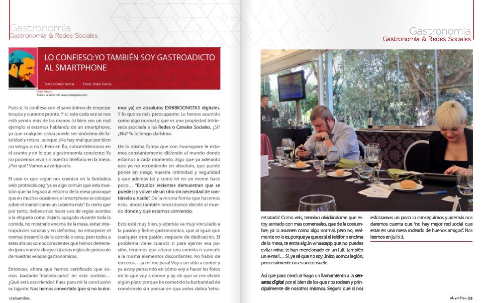 De la misma forma que con Foursquare le estamos constantemente diciendo al mundo donde estamos a cada momento, algo que ya adelanto que yo no recomiendo en absoluto, que puede poner en riesgo nuestra intimidad y seguridad y que además tal y como leí en un meme hace poco… “Estudios recientes demuestran que se puede ir y volver de un sitio sin necesidad de contárselo a nadie”. De la misma forma que hacemos esto, ahora también necesitamos decirle al mundo donde y qué estamos comiendo. Esto está muy bien, y además va muy vinculado a la pasión y fiebre gastronómica, que al igual que cualquier otra pasión, requiere de dedicación. El problema viene cuando si para ejercer esa pasión, tenemos que alterar una comida o sumarle a la misma elementos discordantes. No hablo de terceros… ¡a mí me pasa! Voy a un sitio a comer y ya estoy pensando en cómo voy a hacer las fotos de lo que voy a comer y ay de que se me olvide algún plato porque he cometido la barbaridad de comérmelo sin pensar en que antes debía ‘retratarlo’. Como veis, termino olvidándome que estoy sentado con mas comensales, que de la costumbre, ya lo asumen como algo normal, pero no, realmente no lo es, porque ya que está el teléfono encima de la mesa, te entra algún whassapp que no puedes evitar mirar, te han mencionado en un tuit, también un e-mail… Si, ya sé que no soy único, somos legión, pero realmente no es un consuelo.