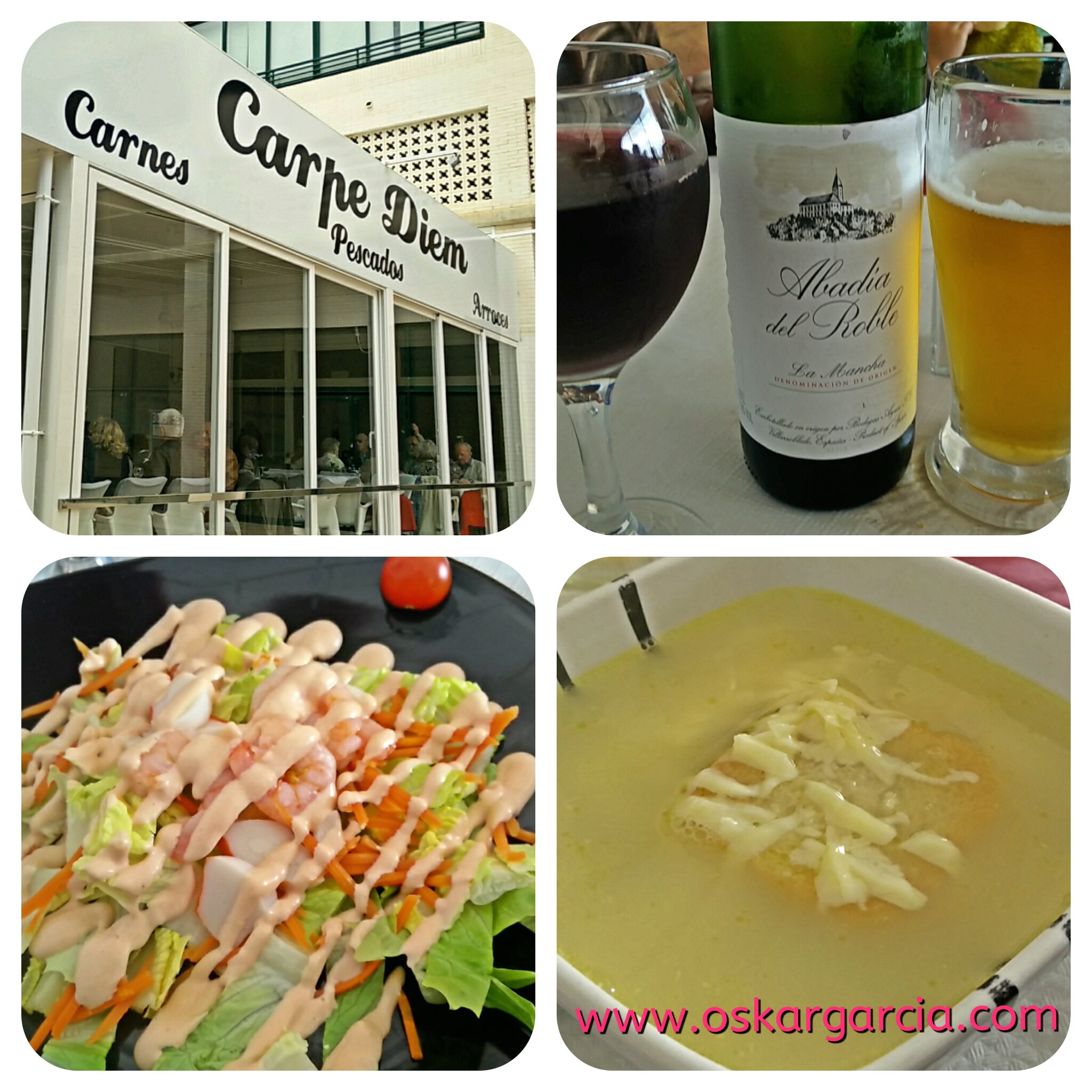 Fuimos recibidos en el Carpe Diem por su propietario y por el personal de sala, que de forma muy atenta nos acompañan a la mesa que previamente habíamos reservado. El local está a tope y me cuentan que no es una excepción por ser festivo. Este sitio (la zona) está trabajando mucho y defendiendo menús del día que se mueven entre los 11,50, 12,50 y los 16€ y la gente, en unos tiempos que no son fáciles, ha recogido el guante y está apoyando una nueva gastronomía diaria y razonable, de precio tremendamente ajustado. Inauguramos mesa con unas cañas y el tinto de la casa, Abadía del Roble, un manchego joven con crianza de color cereza oscuro y sabroso. Tras aposentarnos y refrescar gargantas, pasamos a pedir y lo hacemos sobre el menú del día que ofrece el establecimiento para esta ocasión: 1 entrante individual + plato medio + plato fuerte + postre + bebida. Para cada una de las categorías las opciones son muy variadas y en este caso, como entrante individual nos decantamos por ensalada con salsa rosa y una sopa de cebolla. También había para elegir sopa de pollo o gazpacho. Las ensaladas de muy buen tamaño, con salsa cóctel casera y con lechuga, zanahoria, surimi y gambita. En cuanto a la sopa de cebolla (probé un poquito) muy sabrosa con un buen fondo de caldo de pollo, como debe ser, y ajustada en cantidad de cebolla.