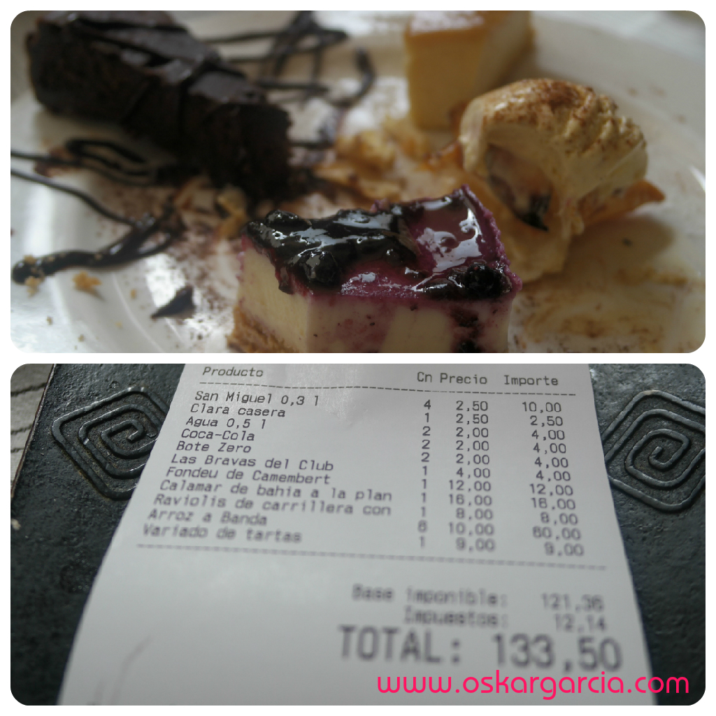 Con el hueco justo para respirar y dejar caer algo dulce pedimos a sala un variadito de postres para cuatro personas y fuimos premiados con un gran plato que contenía un hojaldre de manzana con bola de helado, una porción de tarta ‘Muerte por chocolate‘, una porción de tarta de queso y arándanos y un trozo de flan de queso. Todos sensacionales, y si me tengo que quedar con uno (a pesar de que el chocolate intenso no me vuelve loco en exceso) lo haría con ‘la muerte’: Un gran postre, un bocado goloso y esponjoso. No pedimos cafés y mientras nos llegaba la cuenta, fuimos obsequiados con un rico y fresquito mini sobrete de mojito. Por desgracia no hubo tiempo para tomar uno de los gintonics que prepara Toni ya que los niños con las cometas reclamaban nuestra atención porque la tarde era ideal para hacerlas volar en la playa. Lo dejamos en la lista de ‘pendientes’ para otro día sin duda. El total de esta comida para 4 adultos + 3 niños fue de 133,50€ (33,50 p/p aprox.) Un precio sensacional si al festín gastronómico le sumo todas las atenciones, detalles y gestos que todo el equipo del Club tuvo con nosotros desde el principio hasta el final. Mi enhorabuena a esta gran familia 😉
