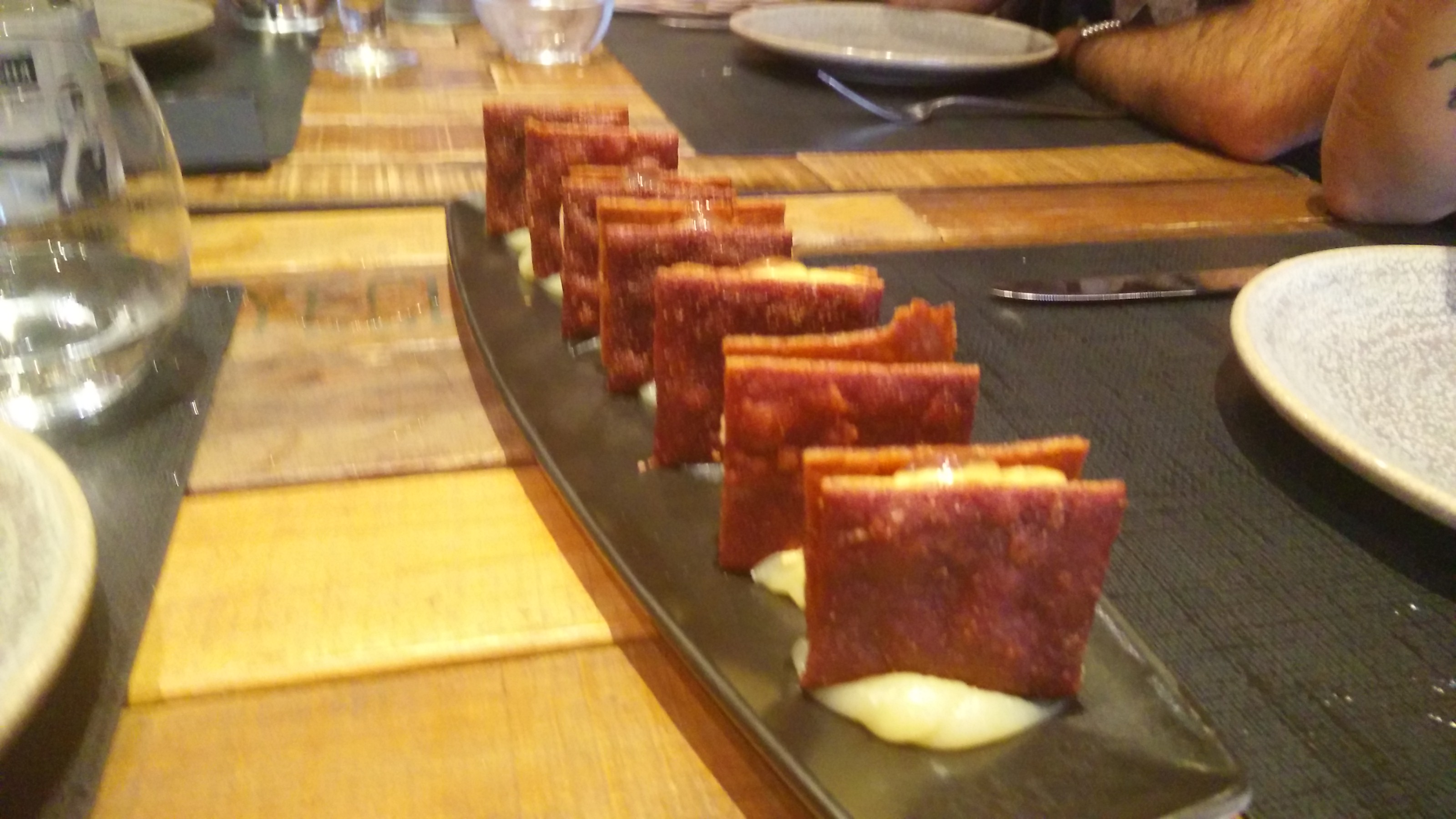 Con algunas botellas de agua y cañas empezó el desfile de propuestas y la primera que hizo acto fue un cucurucho crujiente de salmón, aguacate y wasabi. Original y sabroso. La pasta crujiente a temperatura ambiente, el salmón desmenuzado rellenando el cono y el aguacate en forma de cremosa espuma con huevas en la parte superior y donde también se apreciaba un sutil toque de wasabi.
