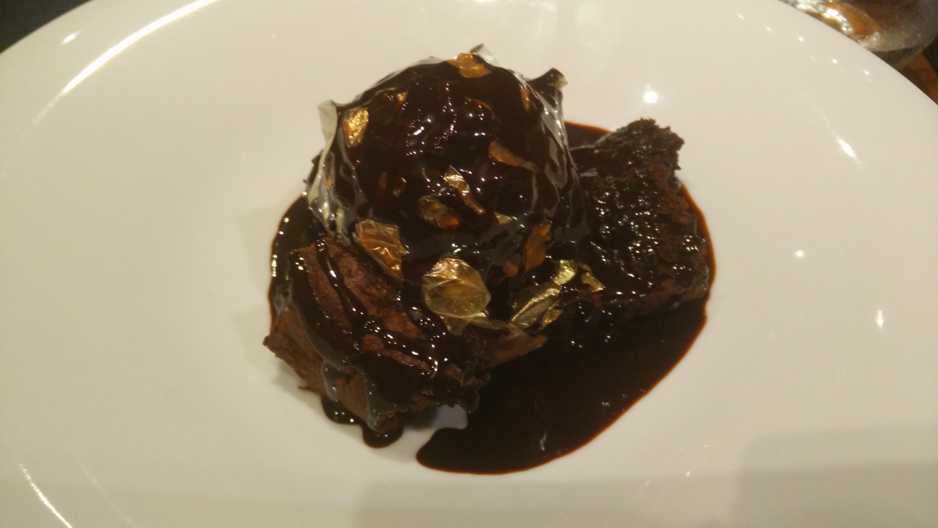 Llegamos al Capítulo postre con Nuevas texturas de chocolate 2015. Si te gusta este producto realmente lo vas a flipar porque es todo un homenaje a él: varios trozos de bizcocho tipo brownie pero mas esponjosos + un bombón gigante al estilo Ferrero Roche con rebozado de cacahuete que a su vez está relleno de helado helado de chocolate que a su vez contiene un corazón de crema de chocolate blanco, todo ello envuelto en una fina película de papel dorado comestible y regado en mesa con chocolate caliente… ¡wow! Ya digo que para los amantes del chocolate este postre se convierte en una cita inexcusable.