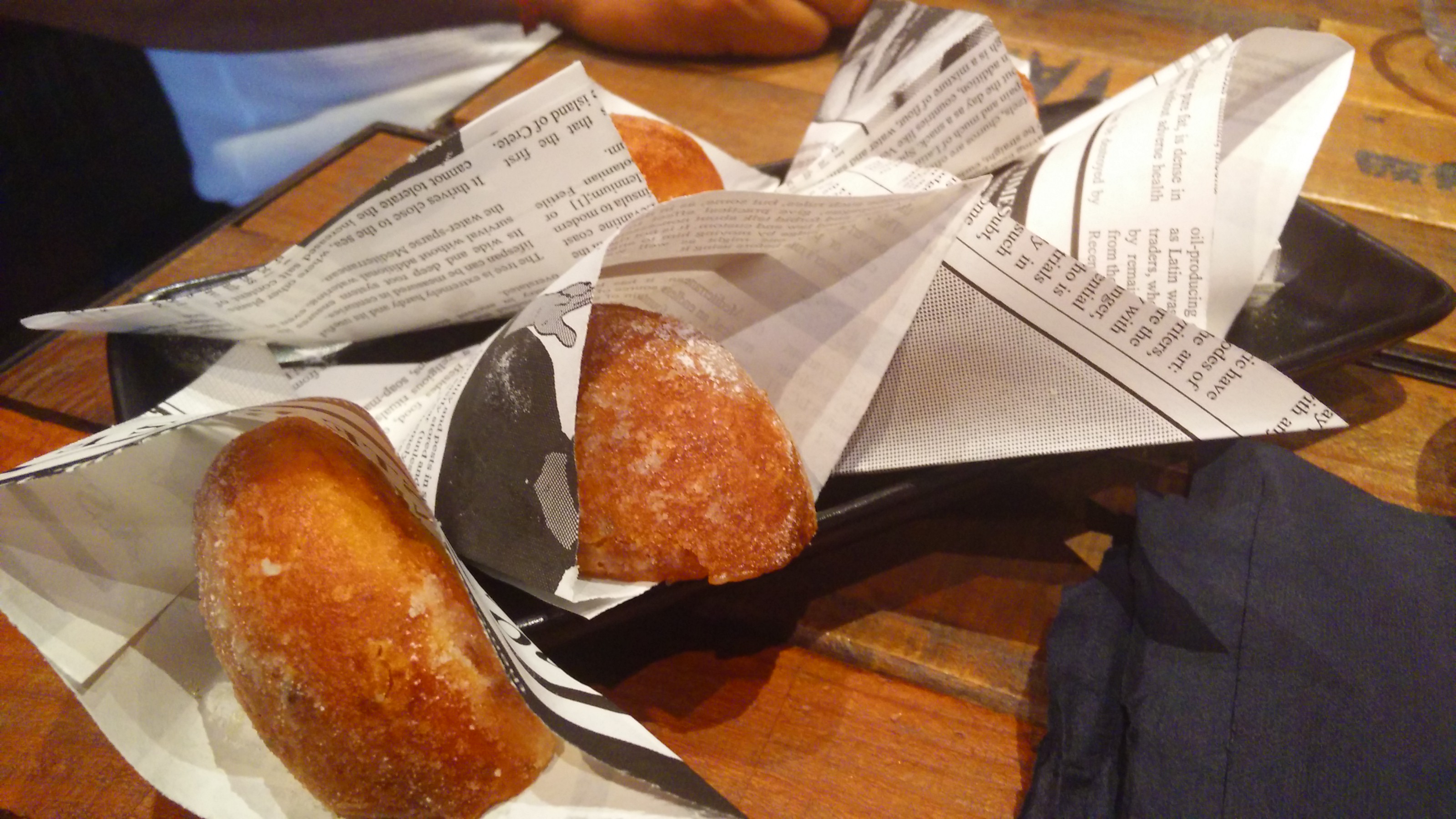 …y cuando estábamos pidiendo los cafés la casa nos obsequió con un ¿post-postre? adicional e inesperado: Medio Bocadillo relleno con crema de anís. Un bocado sensacional con un bollo calentito de masa frita esponjosa tipo buñuelo esponjosa y nada aceitosa relleno de una especie de crema pastelera con toques anisados, todo ello presentado en un cucurucho de papel imitación periódico… ¡dulce información!.