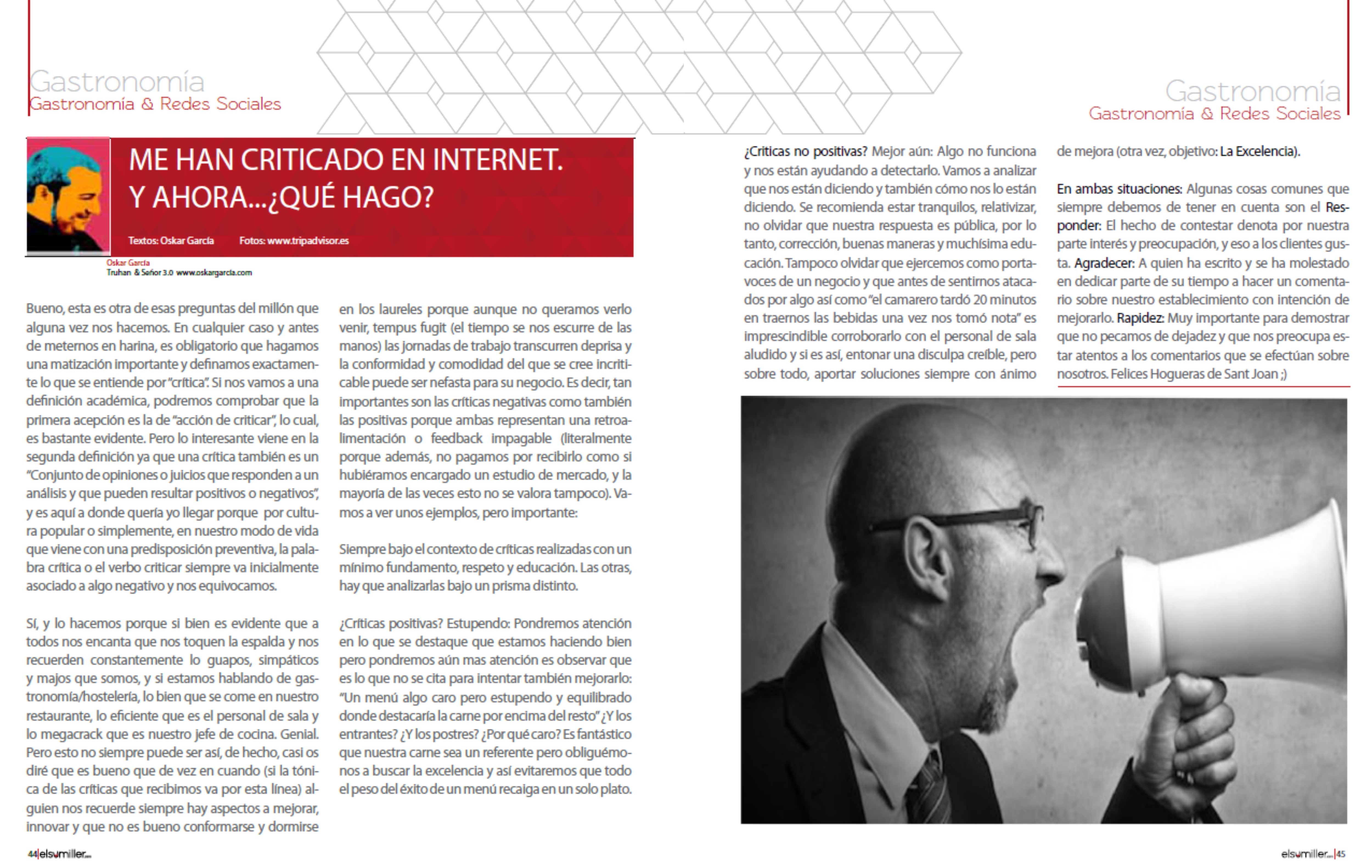 En ambas situaciones: Algunas cosas comunes que siempre debemos de tener en cuenta son el Responder: El hecho de contestar denota por nuestra parte interés y preocupación, y eso a los clientes gusta. Agradecer: A quien ha escrito y se ha molestado en dedicar parte de su tiempo a hacer un comentario sobre nuestro establecimiento con intención de mejorarlo. Rapidez: Muy importante para demostrar que no pecamos de dejadez y que nos preocupa estar atentos a los comentarios que se efectúan sobre nosotros. Hasta el mes que viene, felices Hogueras de Sant Joan.