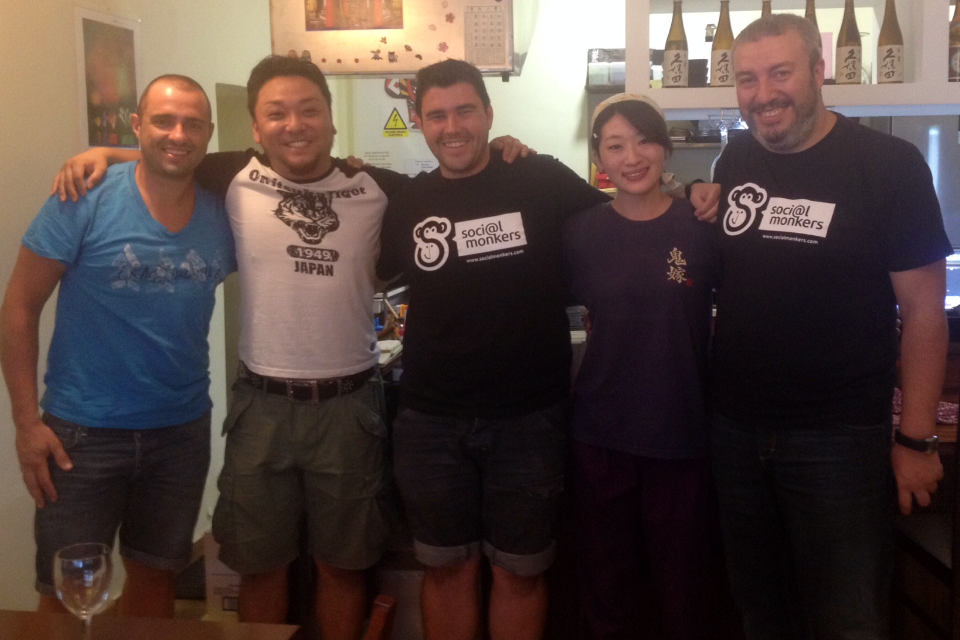 Llegué el primero y mientras mis compis asomaban, pude saludar a Meng Qi, el responsable de la sala y grandísimo anfitrión al que yo tenía también muchas ganas de conocer. Un tipo encantador, auténtico, al igual que su esposa Mizuki, que además es cocinera allí. Me acomodaron en una mesita para 4 con bancos y sillas y para hacer la espera más amena, me fue servida una Asahi, una interesante cerveza japonesa y un bol cerámico de sunomono y que contenía encurtidos a la vinagreta, en este caso algún tipo de alga (no pregunté cual) y pepino muy finito. Rico. Al llegar finalmente a la mesa mis compañeros, pedimos más cervezas, en este caso también Kirin Ichiban, mas suave que la Asahi, y ojeamos la carta de mediodía, que según nos contó Meng, difiere de la de la noche porque cada una incluye lo que él denomina “un producto estrella”. La de la noche incluye sushi y la de mediodía, las afamadas takoyaki que son unas bolas del tamaño de una pelota de pingpong hechas de harina de trigo, huevo, jengibre, algas y trozos de pulpo. Además, se hacen a la plancha y no fritas, lo que para mí es un valor añadido. Teníamos muchas ganas de probarlas y pedimos toda la variedad que había en la carta. También y fuera de carta, vimos que teníamos la posibilidad de probar un plato de verano típico de Japón al estilo de una ensalada y allá que lo pedimos también. Otro de los platos mas reconocidos de la carta son los donburi (que significa cuenco) que están rellenos de arroz y que encima contienen distintos tipos de ingredientes como carne, pescado, marisco, vegetales en distintas salsas. Al igual que con los takoyaki, pedimos varios donburi y viendo la cara de circunstancias que Meng ponía repasando las cantidades pedidas, decidimos parar no fuera a ser que, incluso nosotros, maldecidos con el don de la eterna digestión , nos estuviéramos pasando. 😛