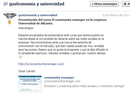 Yo que me había apuntado a la página de Gastronomía y Universidad por mi pública afición a las viandas alicantinas y todo lo que gira alrededor de la alimentación y productos de nuestra provincia he de reconocer que quedé francamente tentado, podría decir que bastante desconcertado. ¿Community Manager? ¿Y eso se estudia? ¿Y en la Universidad de Alicante?. Os seré sincero: Casi paso página y no me apunto. Me pilló en una situación compleja en mi vida, muy compleja. Estaba en pleno desencanto de mi ‘carrera política’, un poco a vuelta de todo, sin un objetivo concreto, y además, debía ser uno de los pocos concejales en España que no tenía ‘un duro’ para poder plantearse este tipo de formación. Pero mira tu por donde apareció Paqui, mi mujer, para decirme una frase que recordaré toda la vida: ‘ Oskar, nos lo quitamos de donde sea pero tu tienes que hacer esta formación si o si, tu vales para esto‘. Dicho y hecho. Ajustamos un poco más el ya maltrecho cinturón familiar y 1 mes después me encontraba cursando el Máster en Experto Universitario en Community Management y Dirección en Redes Sociales para Empresa de la Universidad de Alicante.