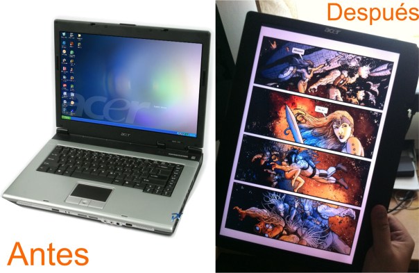 Conclusión: No había nada que me apañara definitivamente ni que me pudiera permitir en estos momentos, pero mira por donde a uno a veces tiene sus momentos y se le enciende la bombilla. Resulta que mis cuñados iban a tirar un viejo portatil ACER ASPIRE 5510 de 15,6″ a la basura porque había dejado de funcionar el WiFi y la batería y no sé muy bien porqué pensé/creí que yo podría ser capaz de transformarlo en un lector para los e-Comics. Pues amig@s, dicho y hecho y aquí tenéis el resultado: