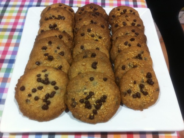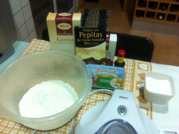 Abrumado ante las cientos, miles, millones diría yo, de peticiones que he recibido para que publique como hago las cookies de chocolate, por fin me he decidido a plasmarlo en un post aprovechando la última hornada recién salida de la factoría. Bueno, hablando ya en serio os diré que es una receta muy sencilla y sobre todo, muy agradecida. Primero porque si tenéis críos por casa, se lo pasarán bomba ayudando a hacerlas, y segundo, porque en el momento que se empiezan a hornear, la cocina se convierte en un improvisado ambientador que te perfuma toda la casa a vainilla y mantequilla, y esto para los que padecemos el mal del «hambre perpetúa» pues como que nos alegra el día :-). En fin, puestos en materia, comentaros que los ingredientes son prácticamente los mismos que se utilizan para hacer la masa del helado de vainilla con cookies y los pongo a continuación: