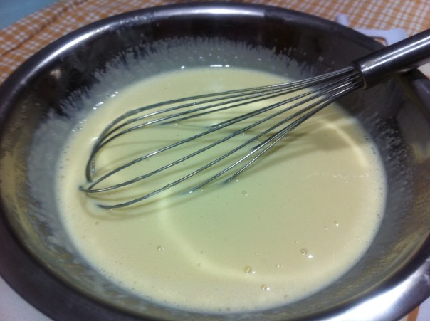 Empecé mezclando la leche con el azúcar invertido y llevé a fuego, removiendo constantemente para que el azúcar se mezclara perfectamente. Por otro lado, preparé las yemas y las mezclé con la nata, a la que previamente le había incorporado la esencia de vainilla. La mezcla de yemas+natas fue incorporada a la leche+azúcar y volvió al fuego sin parar de remover, despacio, pero sin parar. En un ratito empieza a espesar un poco y lo retiro de la placa de inducción, para ponerlo a enfriar. Podemos enfriar rápidamente metiendo el bol en otro con hielo o bien lo dejamos en la nevera removiendo poco a poco, aunque a la nevera, las cosas templadas o calientes, cuantas menos mejor. Al final, la textura y aspecto de la crema inglesa que buscamos es algo parecido a esto: