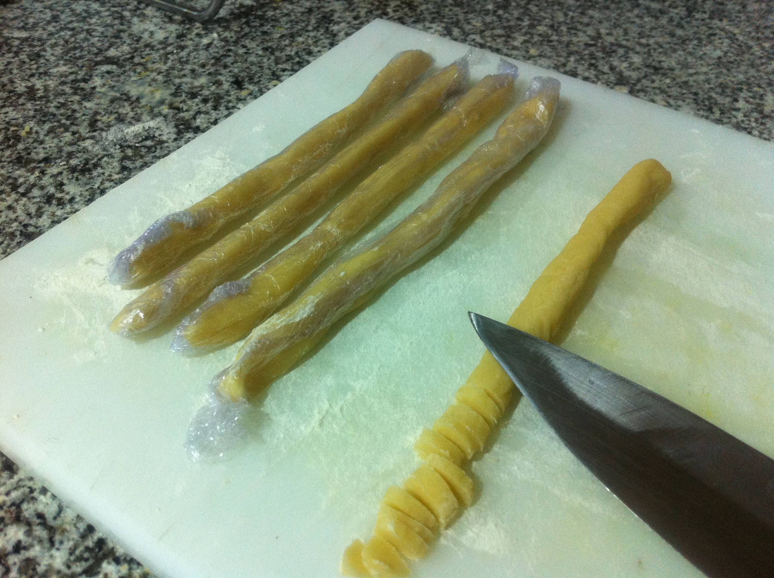 Después cogemos porciones y hacemos canutillos como los que hacíamos de pequeños con la plastilina ( y que otros de mayores hacen líandose unos…. en fin, dejémoslo estar jeje) . Los envolveremos en plástico film y los dejamos un buen rato en la nevera para que se endurezca la masa, en la parte mas fría de la misma a poder ser. Una vez duritos, los troceamos en pequeños trocitos y los reservamos en frío de nuevo.