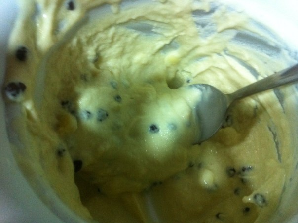 Y llegó el momento de mezclar todo este maremágnum de ingredientes y hacer el helado propiamente dicho. Montada la heladera fui incorporando los distintos componentes, empezando por la crema de vainilla. Normalmente tarda unos 10 o 15 minutos en hacerse el helado, por lo que cuando ví que la cosa empezaba a espesar le añadí en primer lugar la masa de galletas cortada en trocitos y todas las pepitas de chocolate.