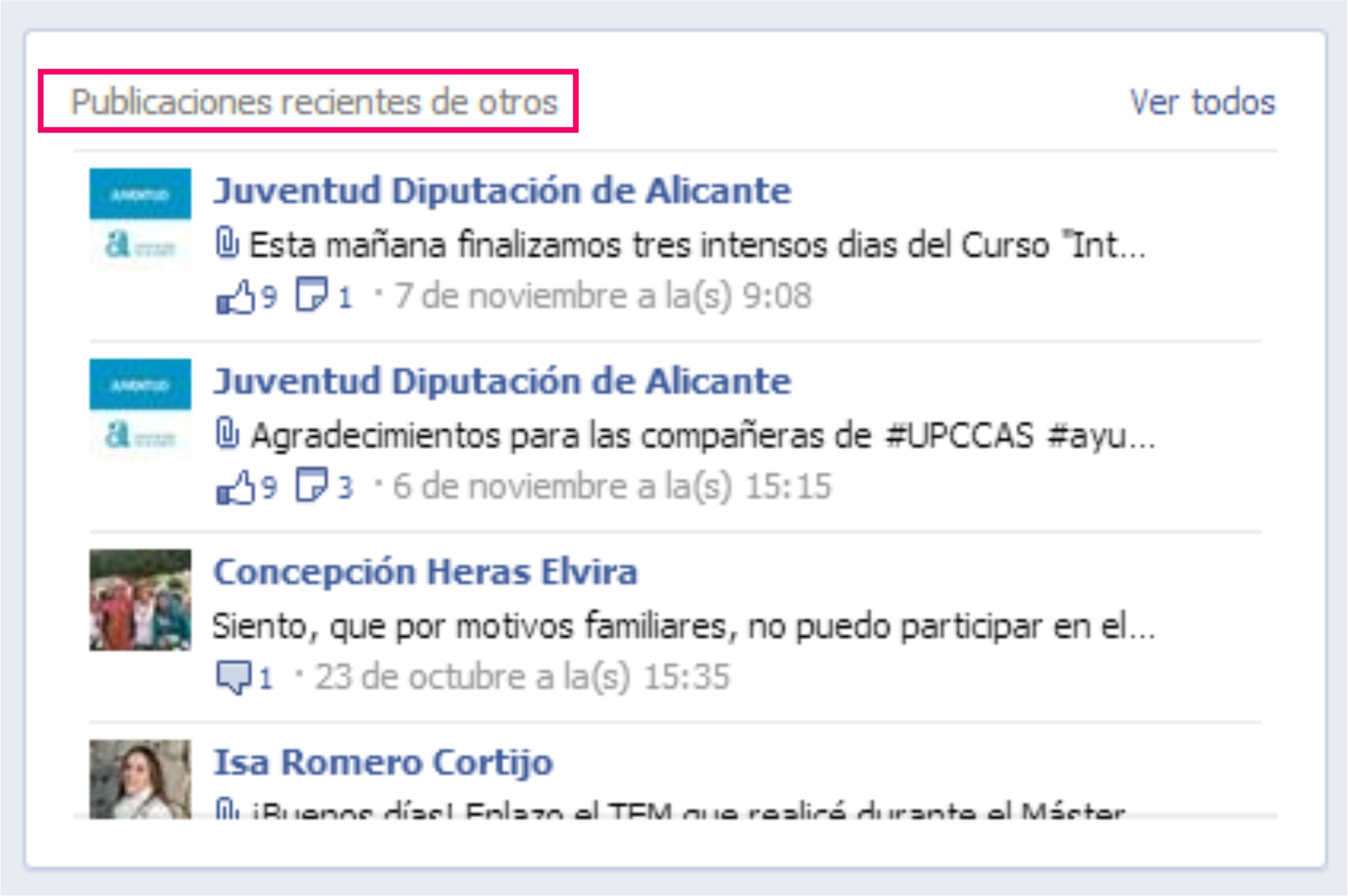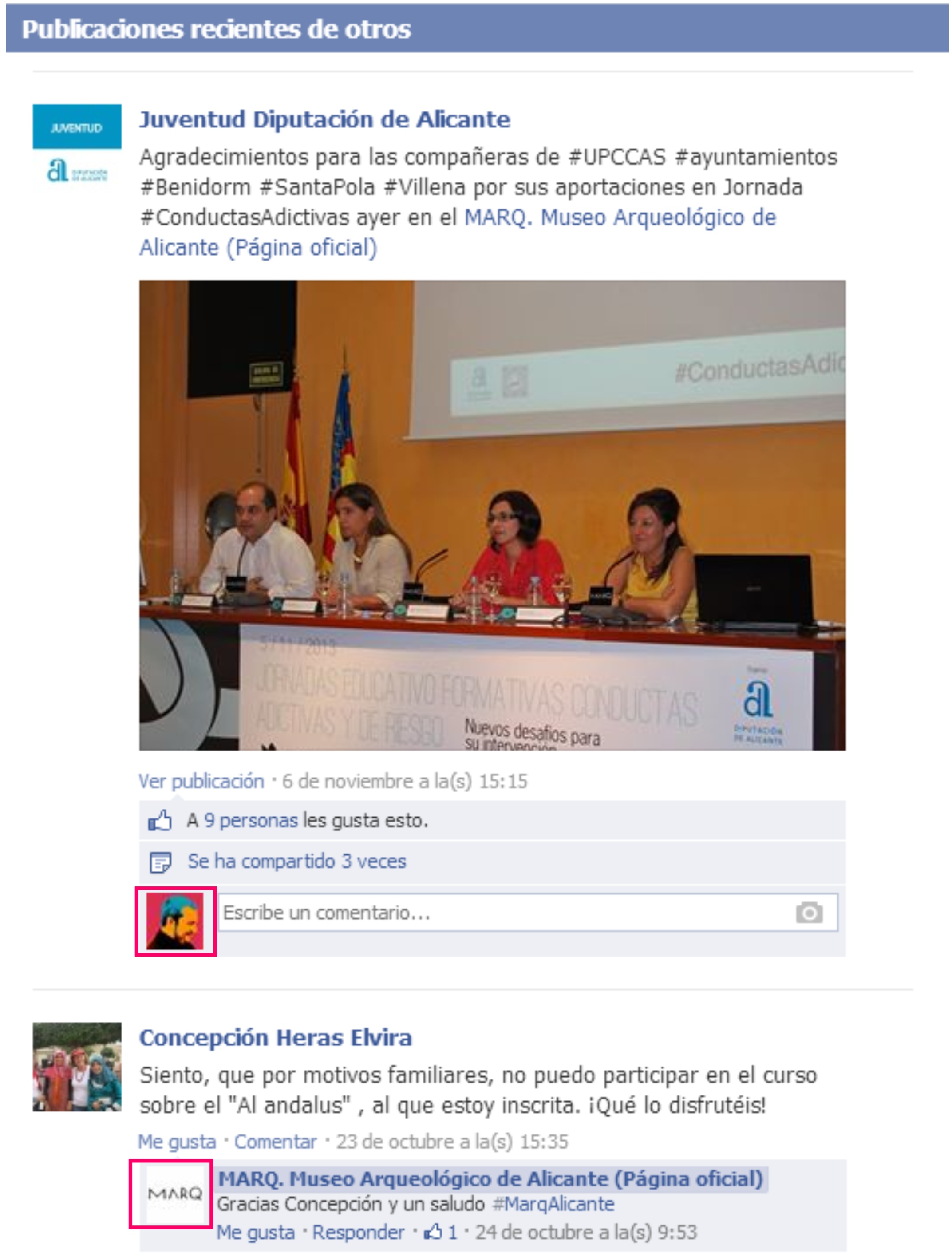 En la parte derecha, un poco inferior a la cabecera, encontramos la sección «Publicaciones recientes de otros«, donde, en teoría, se nos mostrarán las publicaciones directas que un perfil o página hace sobre nuestro muro. Pues bien, no solo eso, ahí también se nos muestran las publicaciones que otras páginas o perfiles hacen sobre nuestra página cada vez que es etiquetada. ¿Curioso verdad?. No quiero extenderme en la crítica de como facebook es capaz de liar a los usuarios con sus decisiones, pero sinceramente, pudiendo diferenciar el tipo de publicaciones es muy forzado ponerlas en el mismo sitio. (de todas formas, ahora os contaré unos truquitos para poder distinguirlas). De lo que verdaderamente debéis ser conscientes es de que SOLO PODREMOS VER AQUELLAS PUBLICACIONES DONDE, EFECTIVAMENTE, SE NOS HAYA ETIQUETADO, PERO CUYO NIVEL DE PRIVACIDAD SEA PÚBLICA. Perdón por el uso de las mayúsculas pero esto hay que recalcarlo muy mucho: Si en mi muro personal, yo hago una publicación y etiqueto a «Marq. Museo Arqueológico de Alicante (Página oficial)» desde el museo nunca lo sabrán porque mis publicaciones son PRIVADAS, y los estatus de Privacidad y Protocolo en facebook, están por encima de cualquier otra regla. Tened esto muy en cuenta. Por cierto, lo que os voy a contar solo vale para publicaciones directas, NO para menciones o etiquetados dentro de hilos de respuesta o conversaciones.