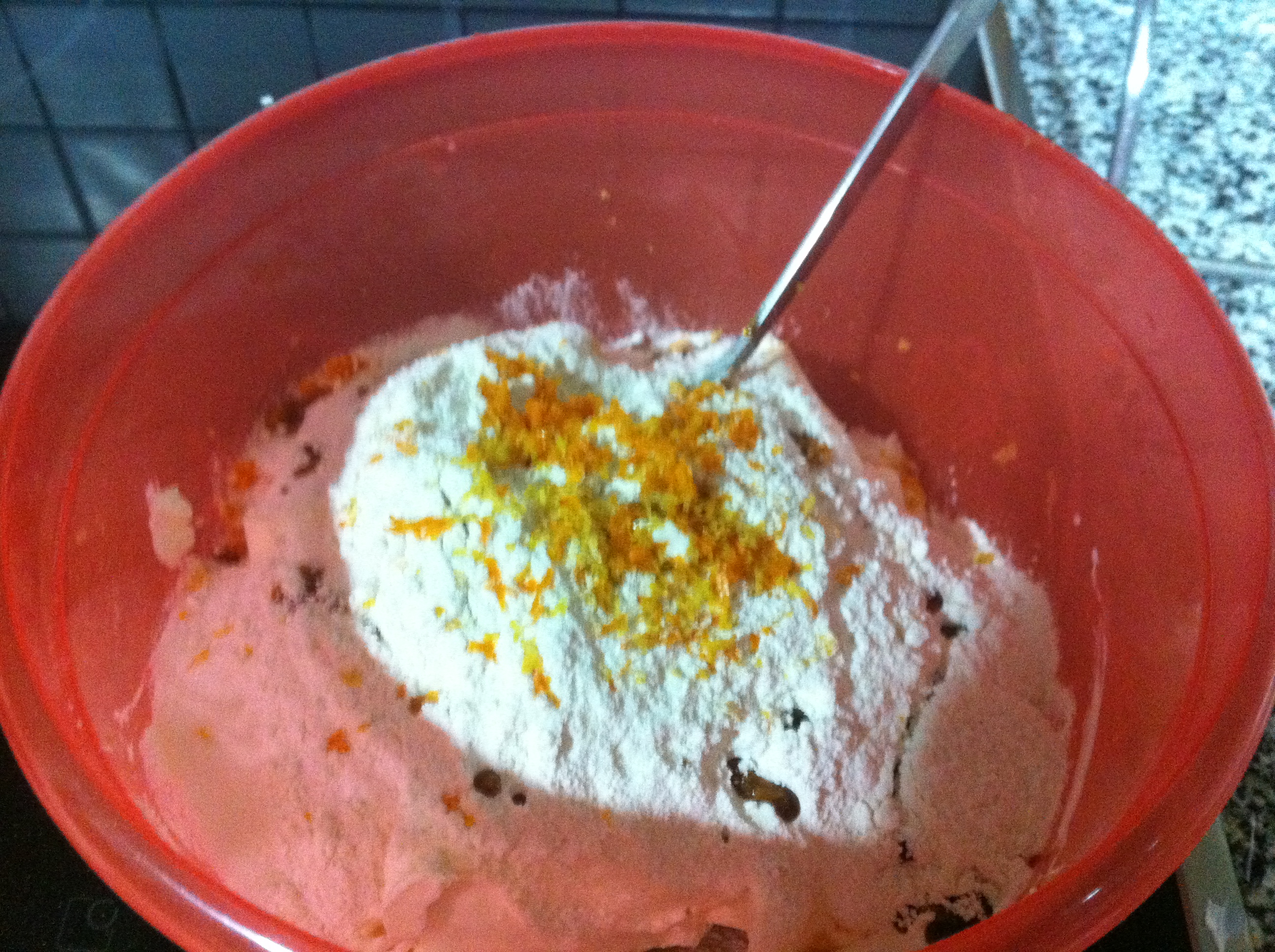 Ahora, incorporamos a un bol la crema de queso, el azúcar, la harina, la nata y las ralladuras de limón-naranja y la esencia de vainilla.