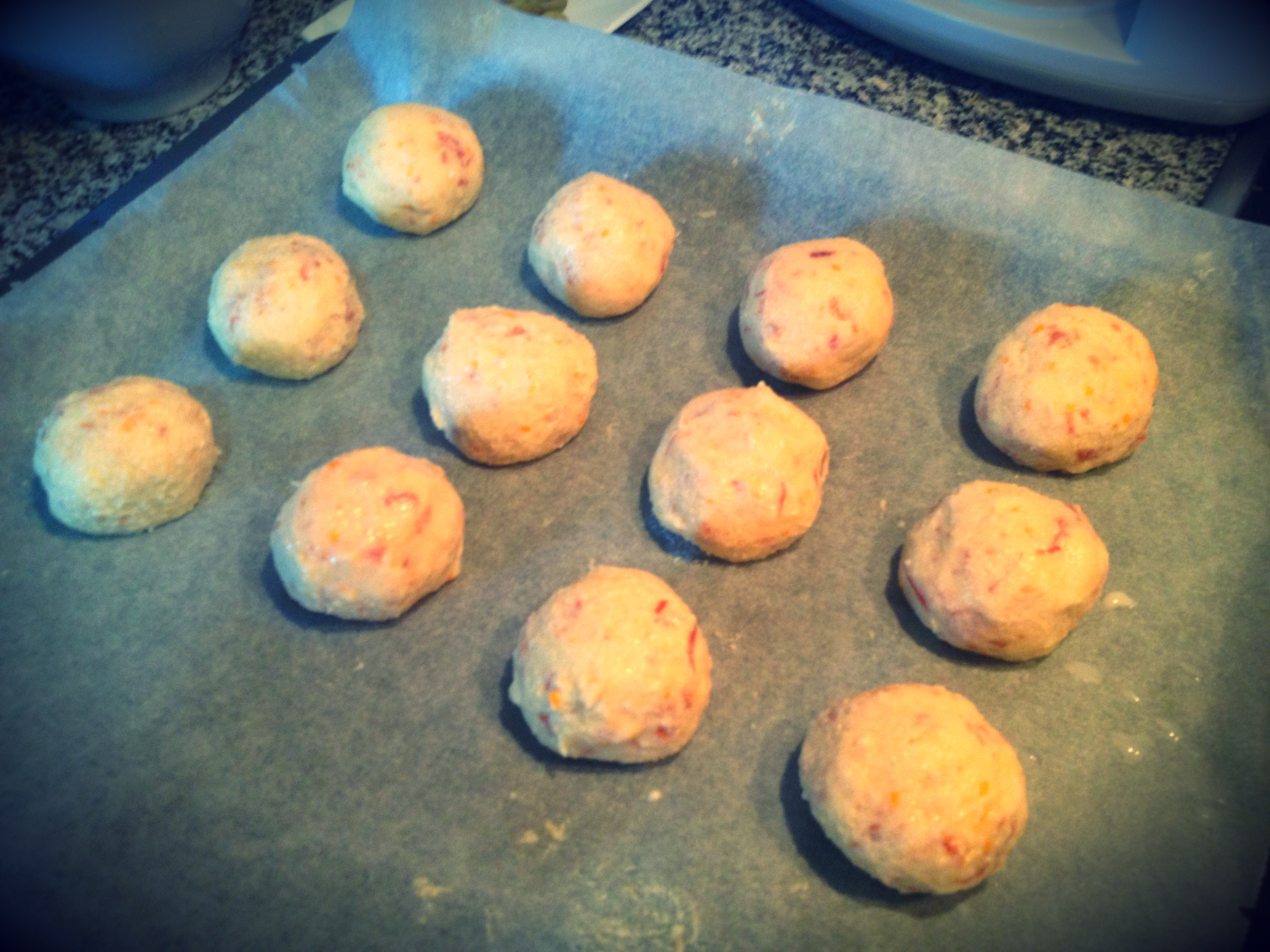 Ponemos a calentar la leche, con 35 seg de microondas a 800w nos vale. Buscamos que esté tibia, no caliente. Mientras, en un bol incorporamos la harina, el aceite, la sal y el azúcar. Cuando la leche esté caliente la incorporamos también al bol y empezamos a mezclar. Cuando tengamos una masa un poquito uniforme, pondremos el queso rallado (yo utilicé un paquete de 4 quesos) y el jamón serrano que previamente habremos desmigado. Seguimos mezclando y finalmente añadimos los huevos, trabajando la masa y buscando como resultado que esta quede compacta. Ahora, vamos a hacer las bolitas. Nos acompañaremos de un tazón con agua del grifo e iremos mojando las manos para facilitar la tarea. Es importante que sepáis que este pan no sube de tamaño, por tanto, el volumen que tengan las bolas es el tamaño que finalmente tendrá el pan. Este es el resultado antes de hornear: